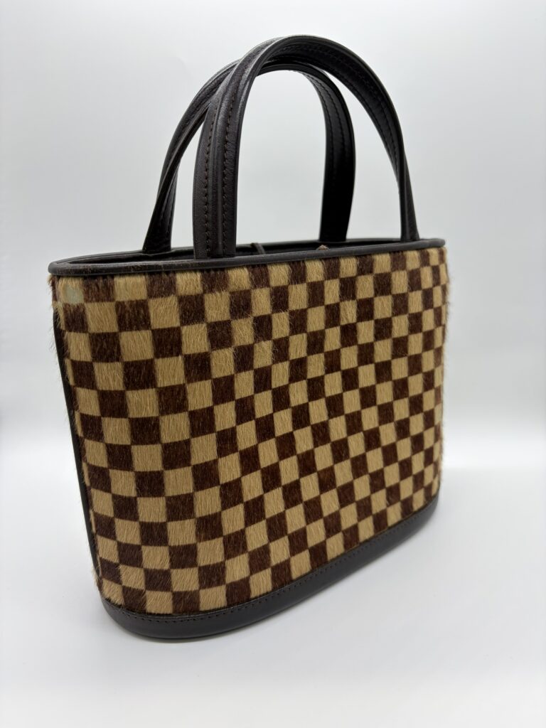 お写真の通り、ハラコ(ポニーヘア)素材を贅沢に使用し、メゾンの象徴であるダミエ柄を表現した非常に珍しいモデルです。落ち着いたブラウンカラーの市松模様が、ハラコ特有の毛並みと合わさることで、立体的で奥深い表情を見せてくれます。