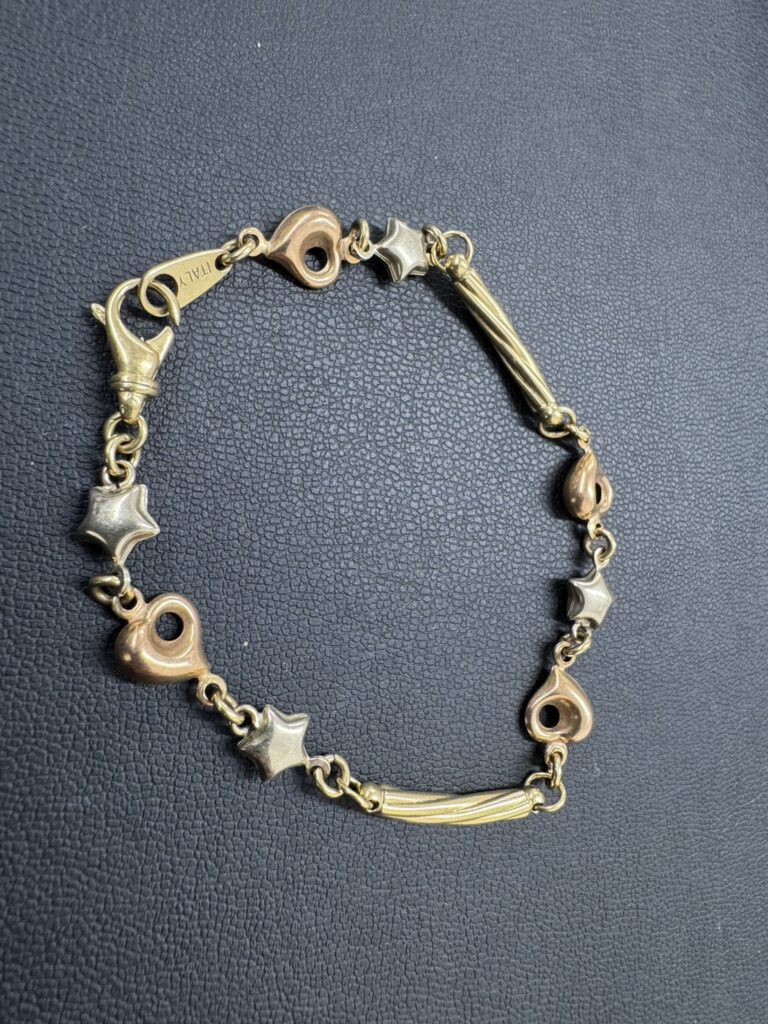 イエローゴールドを基調とし、星型・ハート型モチーフが連なったデザイン性の高いK18ブレスレットです。