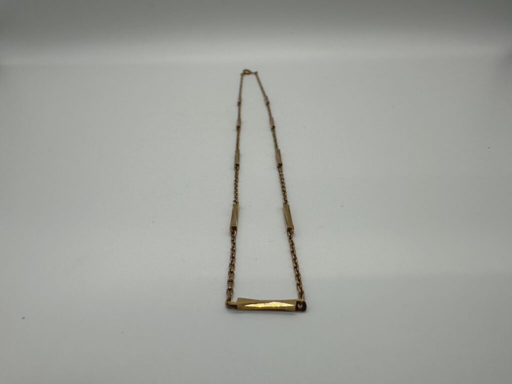 お写真をご覧いただくと、等間隔に組み込まれたバー状のパーツが、光を受けて表情豊かな輝きを放っているのがわかります。シンプルなチェーンに一工夫加えたこのようなデザインは、首元をより華やかに、かつ知的な印象に見せてくれますね。