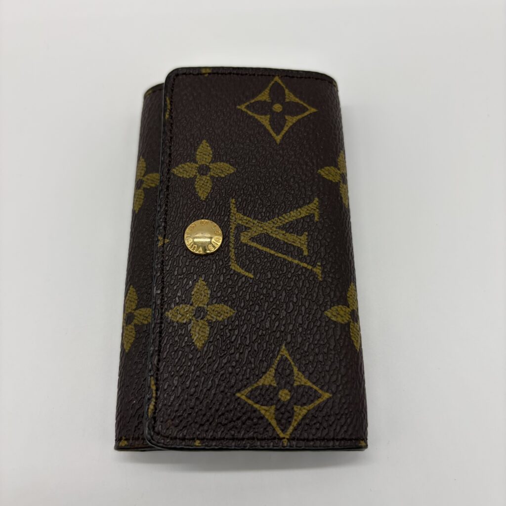 内側を確認すると、ゴールドに輝く6つのキーフックが綺麗に並んでいます。金具の部分を近くで見ると、細かな傷こそありますが、ルイ・ヴィトンの刻印もしっかりと確認できる状態です。こうした小物はどうしても使用感が出やすいものですが、モノグラムのキャンバス地は非常に丈夫なため、まだまだ長くお使いいただけるお品物です。
