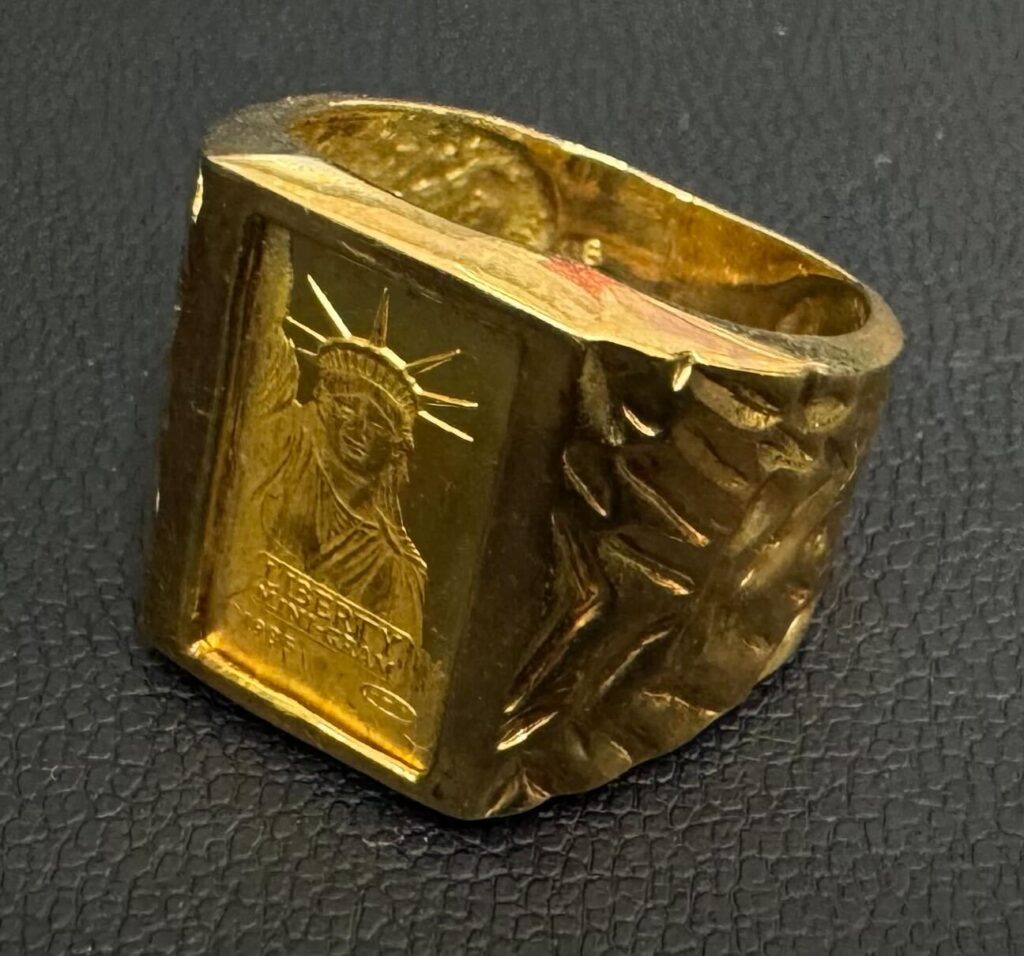 中央には自由の女神が刻まれたインゴットがあしらわれており、資産価値とデザイン性を兼ね備えた印象的なリングです。素材には18金(K18)が使用されており、純度や重量をしっかり確認したうえで査定させていただきました。