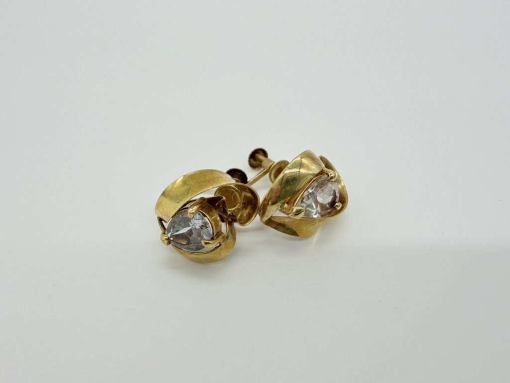 お写真をご覧ください。光を透過して澄み渡るような石が、しずく型のペアシェイプにカットされており、動くたびに耳元を華やかに彩ります。石を包み込むゴールドのフレームは、まるで柔らかい布が翻るような優美な曲線を描いており、当時の職人の技術の高さが伺えますね。