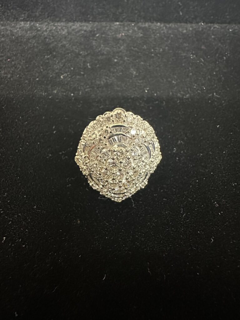 お写真をご覧ください。中央から溢れ出すような輝きは、ラウンドブリリアントカットとバゲットカットのダイヤモンドが緻密に組み合わされることで生まれています。ドーム状にセッティングされたこの立体感は、どの角度から見ても光を取り込み、持ち主の所作を優雅に演出してくれますね。
